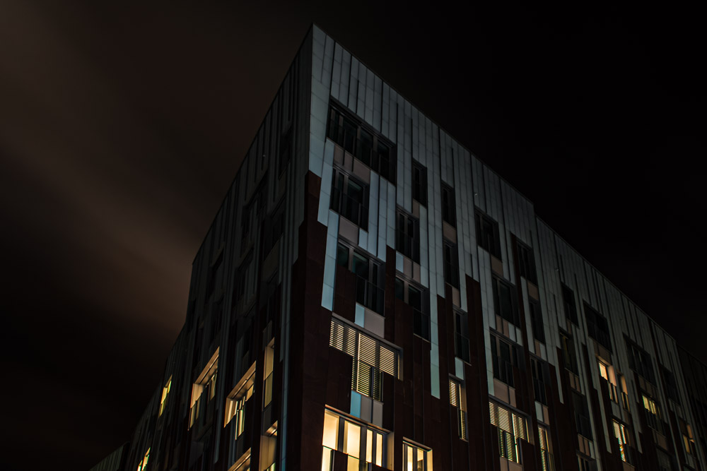 Für mich ist dieser Stadtteil fotografisch überaus spannend. Nur die Straßenbeleuchtung ist leider unzulänglich, denn die hier verwendeten Lampen erzeugen auf Nachtbildern störende Lichtreflexe. Kugelförmige / kreisrunde Lichter wären besser gewesen. Dann hätte es auch mit den Sonnensternen geklappt. Lieber Bürgermeister: Bei der Planung neuer Stadtteile bitte immer einen Jörn Daberkow hinzuziehen!