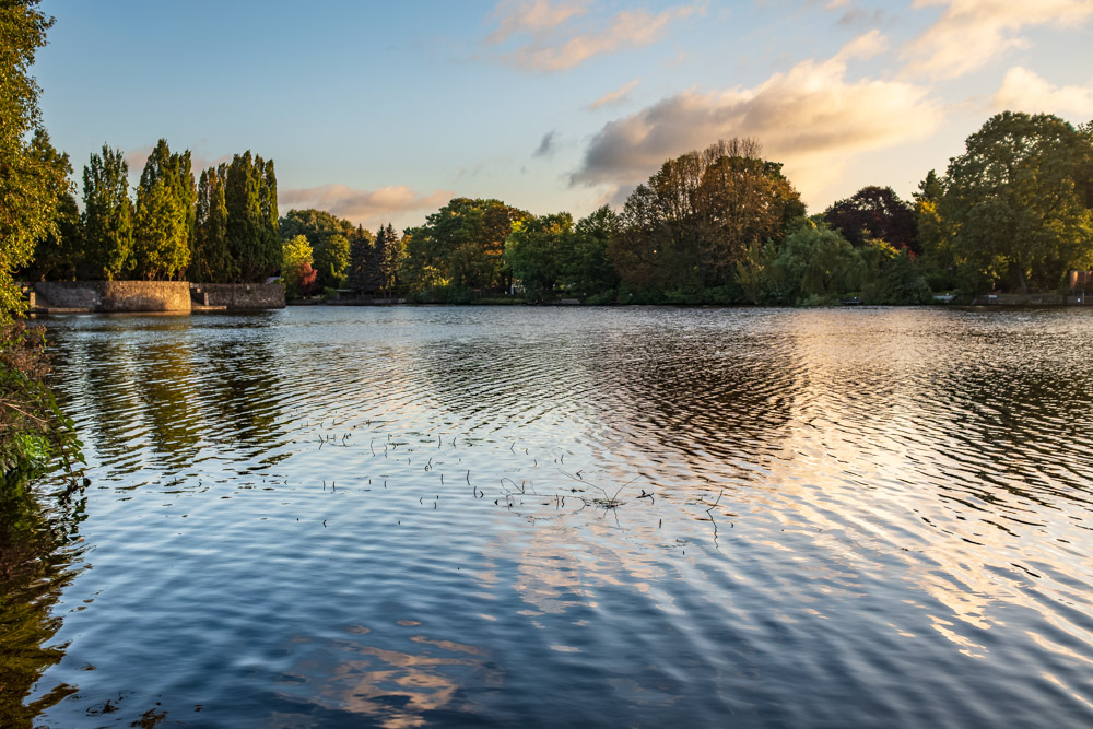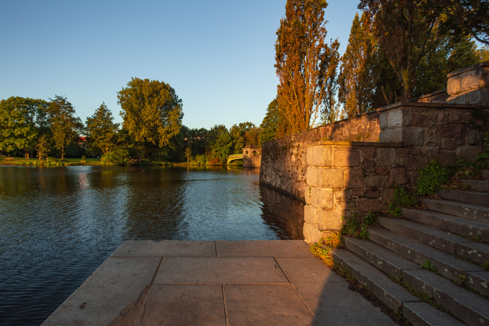 Der Park liegt direkt an der Alster, die ringsum von grauen Steinwänden begrenzt wird. In Kombination mit dem vielen Grün und den gepflegten Altbauten am Ufer ergibt sich ein sehr schönes Gesamtbild.