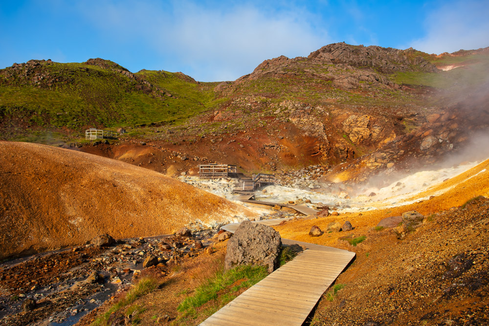 Das Vulkansystem an diesem Ort heißt Krýsuvík und ist als „Geothermal Area“ gekennzeichnet. Innerhalb dieses (aktiven!) Vulkansystems liegt das Hochtemperatur-Gebiet Seltún. Es riecht intensiv nach Schwefel. Rauchschwaden ziehen über das Gelände. Seltún ist mittels Holzbohlenweg und einer kleinen Aussichtsplattform für Besucher erschlossen.