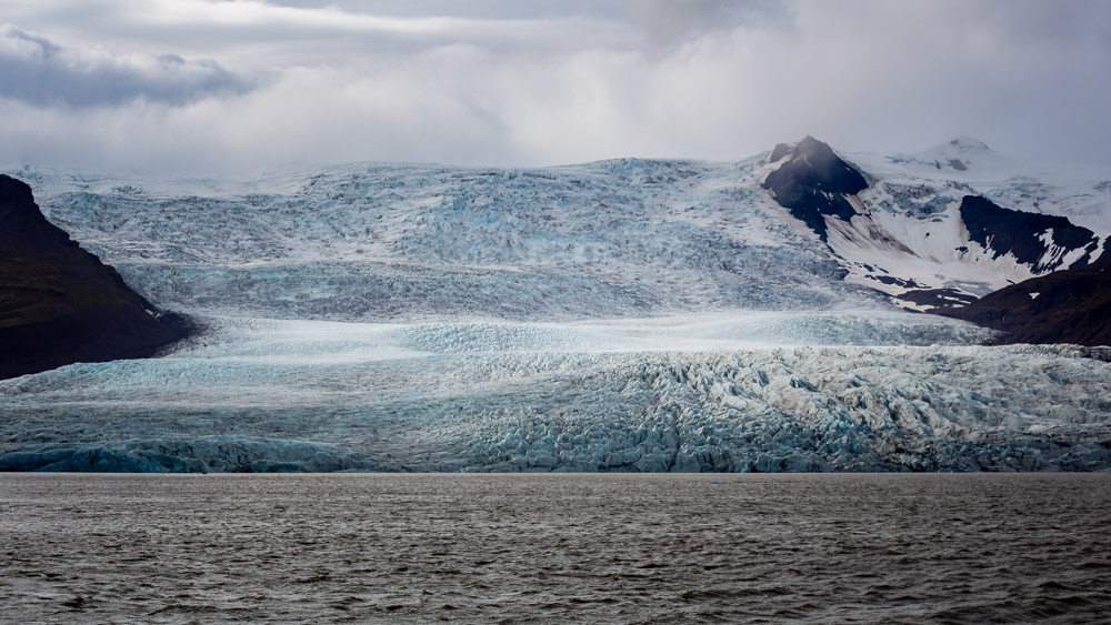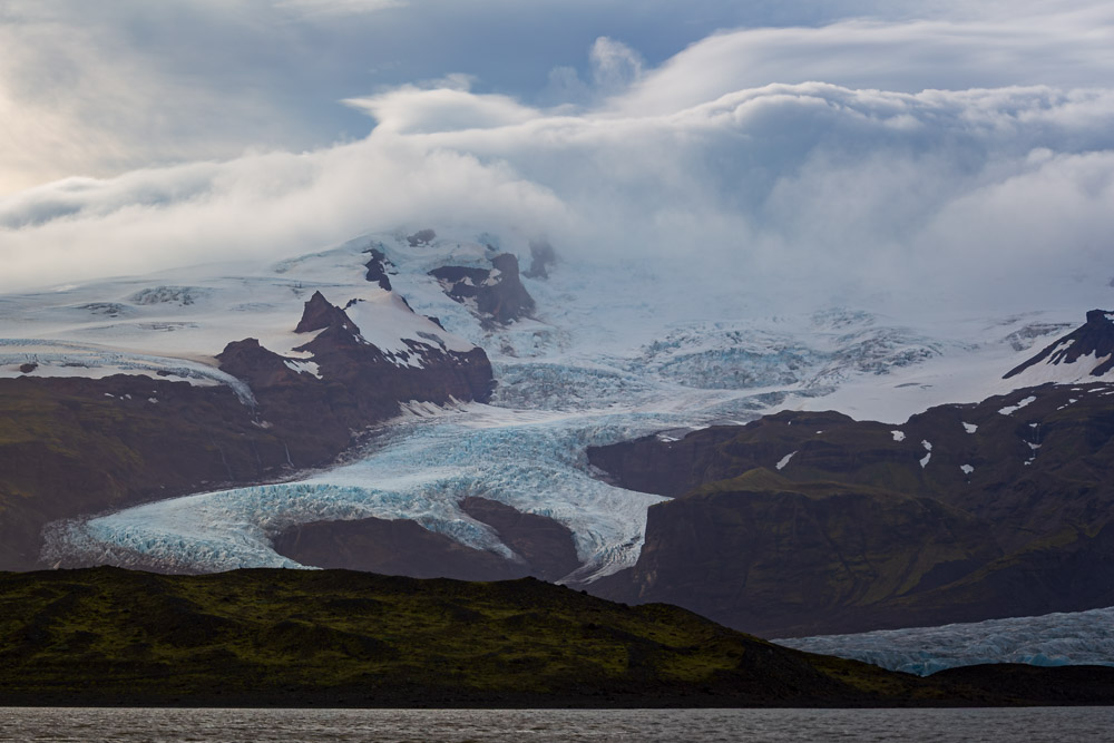 Weiter ging es am Fjallsárlón-Gletschersee. Dieser präsentierte sich völlig anders als das Pendant zuvor. Das lag vor allem an den hier besser sichtbaren Dimensionen des eigentlichen Gletschers Vatnajökull, dem umliegenden Gebirge und den an diesem Tag dramatischen Wolken. Gerade über letztere war ich ziemlich froh, denn die haben für eindrucksollere Ansichten gesorgt, als es ein wolkenloser Himmel vermocht hätte.