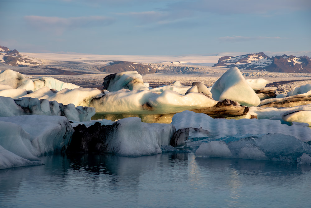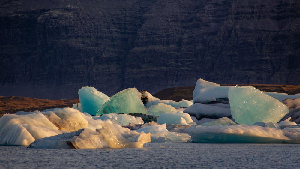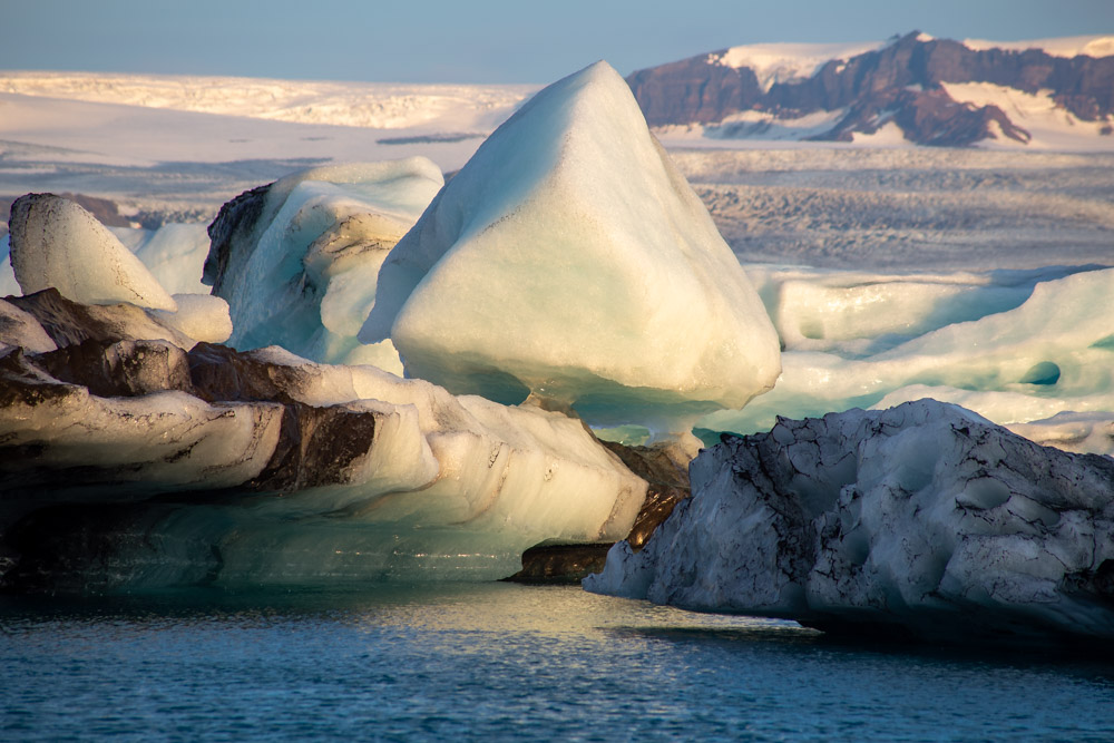 Im Hintergrund die „Quelle“ für all das Eis: Der Vatnajökull-Gletscher. Gigantisch. Bis zum Horizont. Ich schaue nur kurz dorthin. Mit einem Auge. Meine Aufmerksamkeit hat sich längst auf unzählige „kalte“ Motive gerichtet.