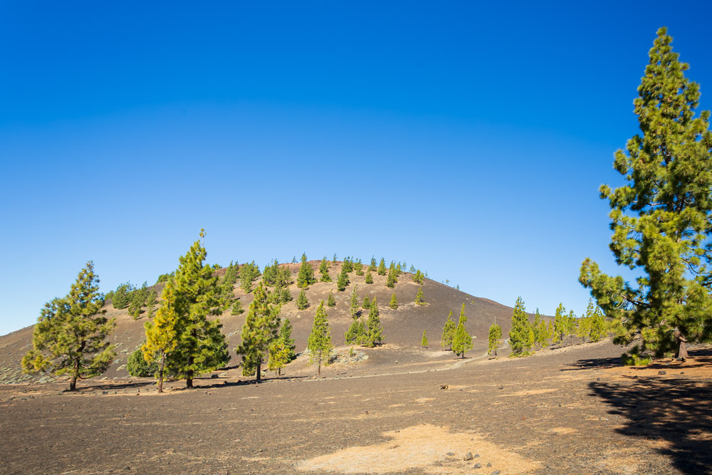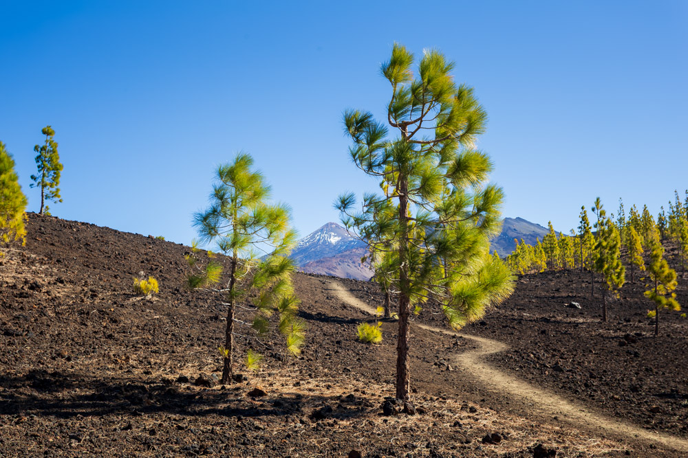 Man schaut durchgängig auf einen Pinienwald und vulkanisch geprägten Boden. Wer eh’ auf Teneriffa ist sollte hier vorbeischauen. Es ist richtig schön und bequem erreichbar, weil direkt vor dem Wanderweg ein Parkplatz zur Verfügung steht. Zufällig habe ich beim ersten Besuch gleich die Geodaten aufgezeichnet: 28°16’0.294″ N 16°43’33.324″ W